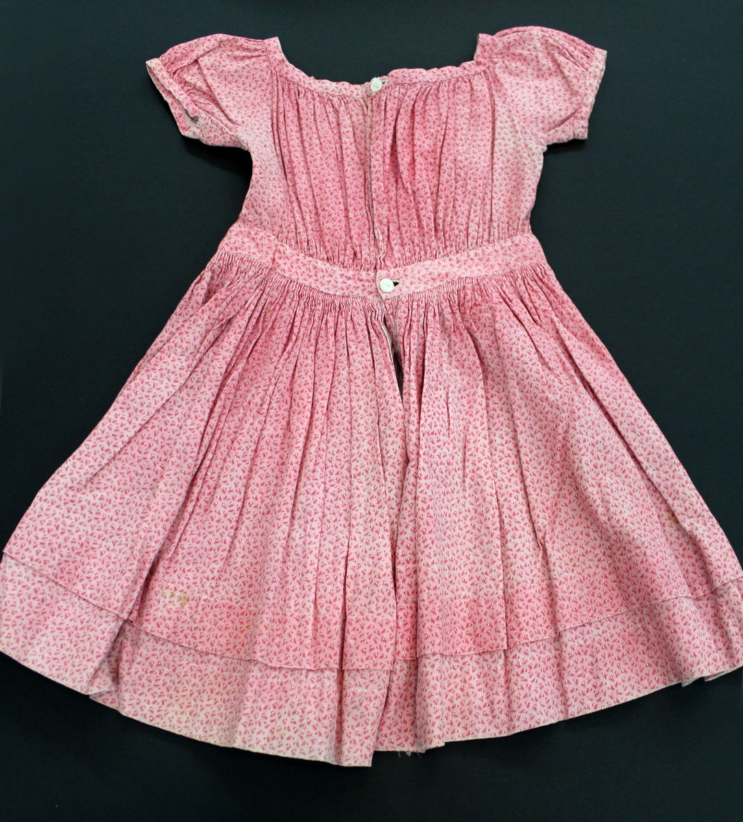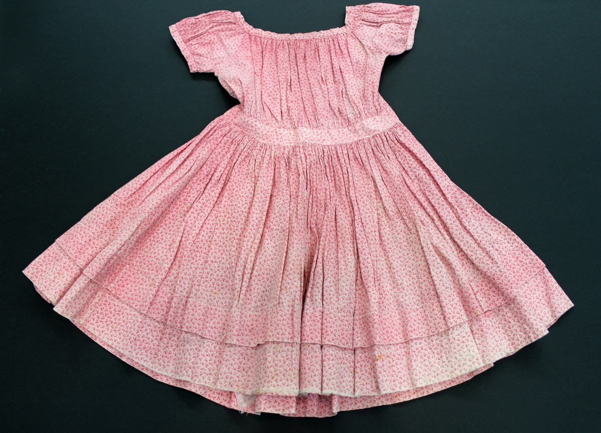Pink cotton calico dress printed with tiny red and white sprays; off-the-shoulder neckline, short puff sleeves gathered at neck and cuffs; narrow waistband with gathered bodice and full skirt; grow tuck pleat above hem line; fastens at back with pearl buttons at neck and waist