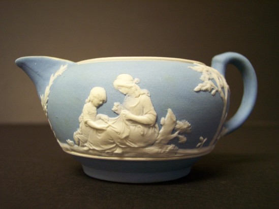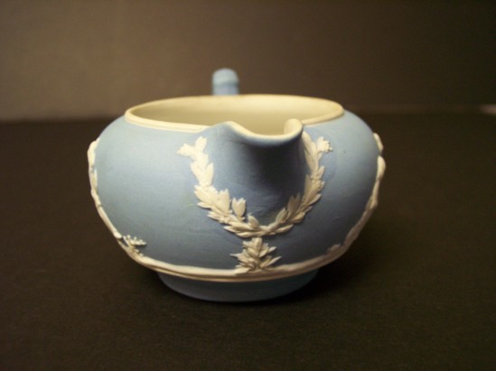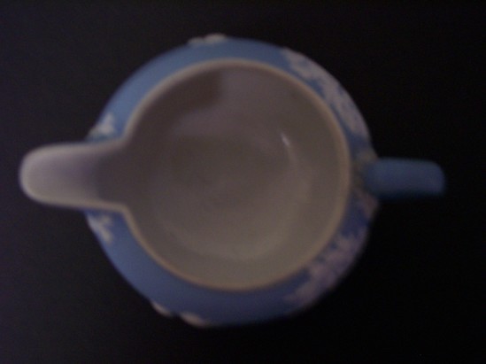 Simple, small, light blue jasper pitcher with ear-handle and simple spout. White Flaxman type decorations applied around body. Round pitcher. Stamped "Wedgwood -- England" on bottom. Same motifs as on pitcher 1911-04-16.