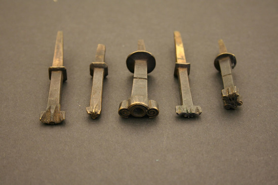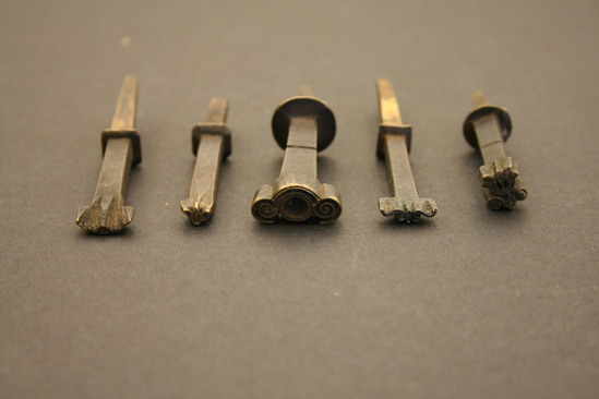 Five brass stamping dies; used by Erastus Lord in leather working production Each stamp head has a different design or swirled lines and loops; behind each stamp head irregular shaped rectangular rod; half way down rod is flat protrusion