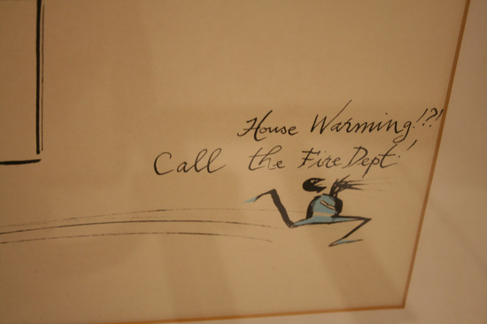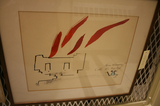 Ink and gouache drawing of an abstract building with stepped roof and two windows. Building is rendered in black ink with four large flames rising from the roof, done in red gouache. A small figure outlined in black with blue clothing is seen running away from the house, in lower-right corner. Written just above figure in ink, "House Warming!?!/Call the Fire Dept.!" White mat board, wooden frame, under glass.