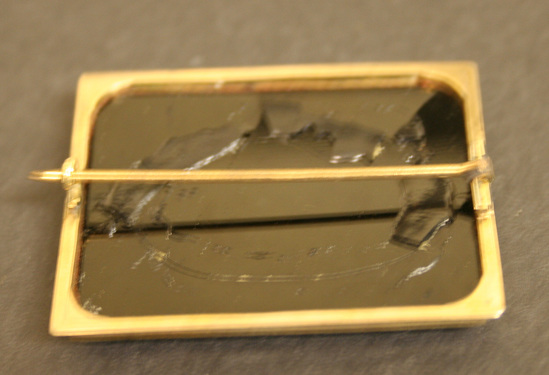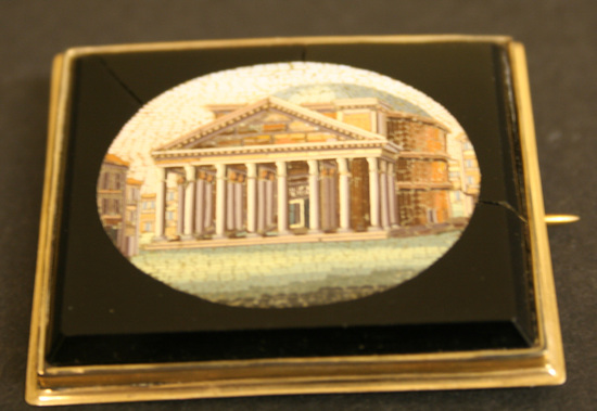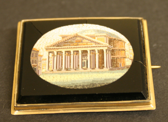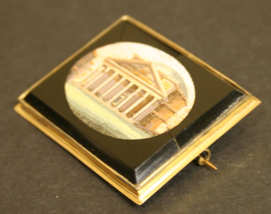 Square shaped brooch. Gold setting with pronounced lip around bottom of setting. Horizontal pin on back. Oval shaped micro-mosaic in center set in black jet. Mosaic shows image of Temple of Vesta.
