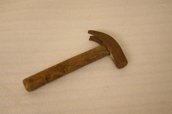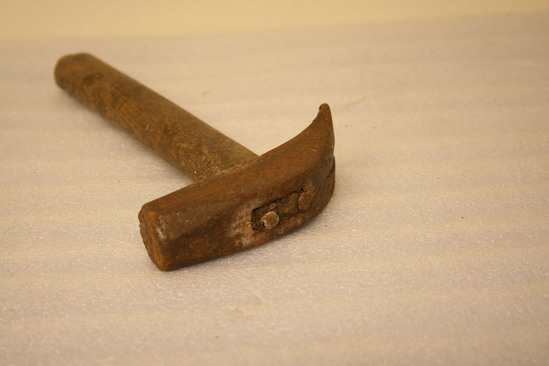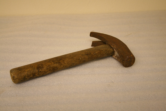Hammer - iron head with wooden handle. Handle pierces center of iron head. Two nails at top.