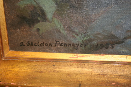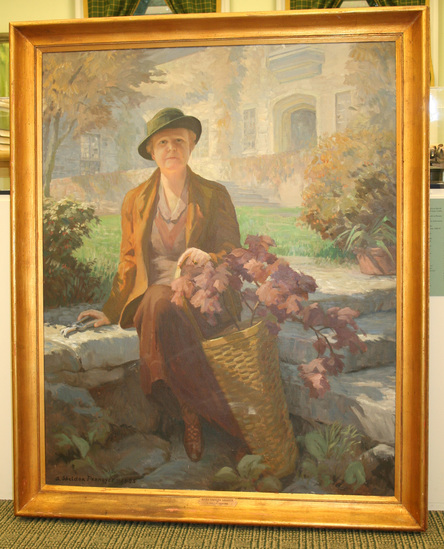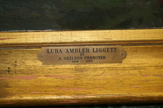Oil on canvas. Full body portrait of Lura Ambler Liggett. Here she is an older woman sitting on a stone wall and there is a stone building in the background. She is wearing a green hat, a brown jacket, a purple/grey shirt, a brown skirt, and brown laced shoes. On the right, a long basket is leaning on her containing purple flowers and she has her left hand resting on the handle. On this hand, on her middle finger is a ring. Her right hand is touching a pair of gardening shears. She is shaded by trees on either side of her. The painting is signed in the lower left hand corner "A. Sheldon Pennoyer" Framed in a wooden frame painted gold. Small oval shaped brass plaque at bottom stating name of sitter and artist.