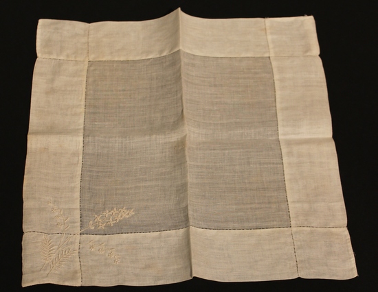 Square ivory linen handkerchief; deep hems with fine drawnwork; delicate floral/fauna embroidery in one corner.