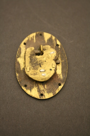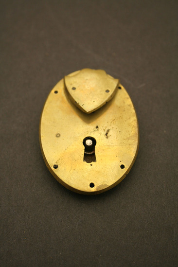 Oval brass lock, key hole at bottom, six small holes - three around bottom and three around top at outer edge; shield shaped piece attached at top but loose; backside has locking mechanism but covered by brass plate