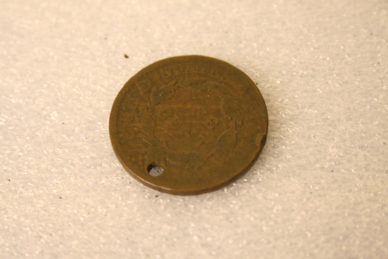 1 cent coin, large, image of Liberty on front; laurel wreath and USA on back.