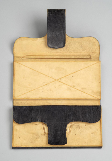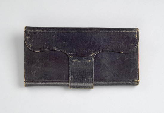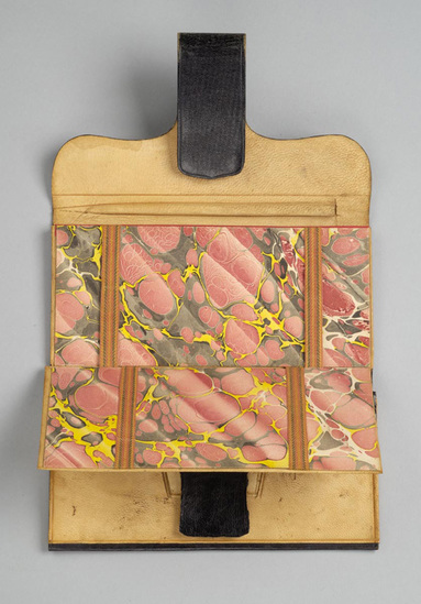 Black leather tri-fold wallet, two interior pockets. Upper pocket is accordian style with fold out structure and linen straps. Interior of fold out structure decorated with marbelized paper. Accordian style bottom pocket with additional accordian style pocket and flap. Above upper pocket is a pocket for a pencil. Maker's stamp located under top flap of wallet with dotted border "E.A. Lord/Maker/Litchfield, Conn" Wallet closes with leather strap