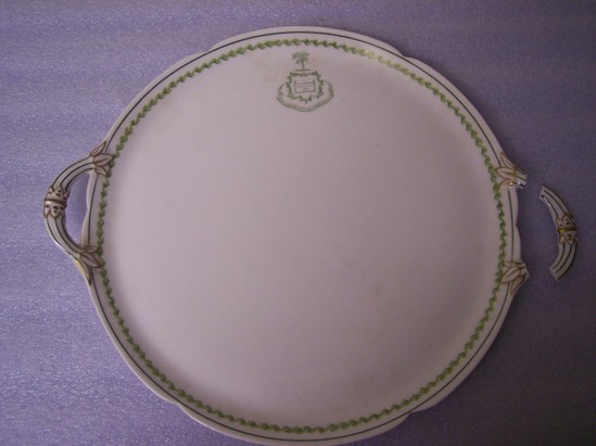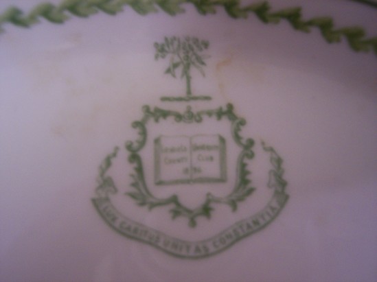 Green lines and chain of leaves on edges of white platter. Green shield with tree crest in a rococo frame around a book with "Litchfield County/University Club/1896" and scroll underneath with "Lux Caritus Unitas Constantis" centered at the top.
