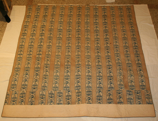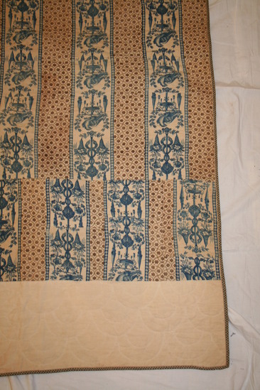 Quilt made of alternating vertical strips of fabric. The face fabric appears to be a plate printed or block printed linen monochrome stripes with alternating stripes and is most probably English c.1800-1805. The first stripe is a classical design of an eagle in laurel wreath atop an epergne which in turn rests on a cadeusus surrounded by cornucopias of flowers. There is a small sprig border on each side. The alternating stripes are small stars in chains obviously block printed in brown. Binding is a checkerboard pattern woven tape in dark green and white. Backing is cotton. The coverlet is quilted in a scallop shell design. Fabric is 27 1/4 inches wide, vertical repeat 8 inches and is pieced at the top and along right side of coverlet.