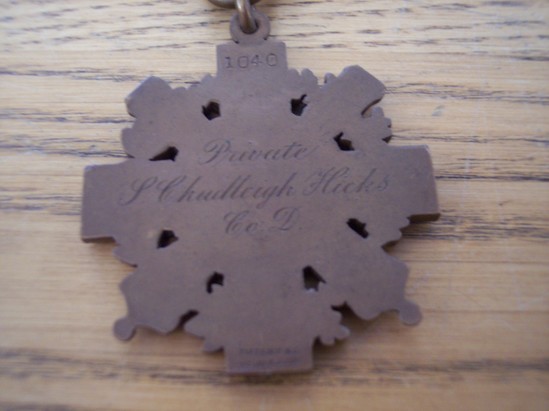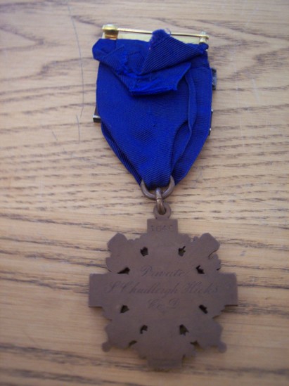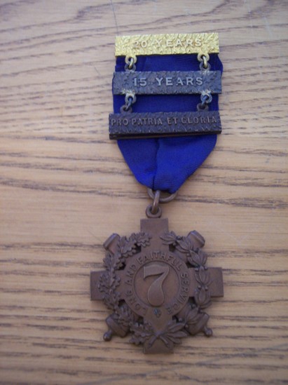 Pin bar, gold with rough finish, and "20 YEARS" two links below on each side then attached a second bar, silver with oak leaf background and "15 YEARS", two links and brass bar with same background "PRO PATRIA ET GLORIA" Background blue ribbon with link and large bronze cross with crossed cannons at 90 degrees, oak and laurel cluster aruond, large "7" in center with "LONG AND FAITHFUL SERVE" around. Back is plain, inscribed "1040/Private/J. Chudleigh Hicks/Co. D". "Tiffany & Co" and "Ditto/Pat. Mar 3, 1880" at bottom