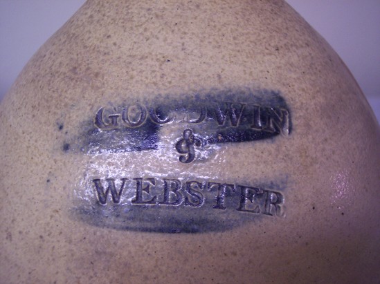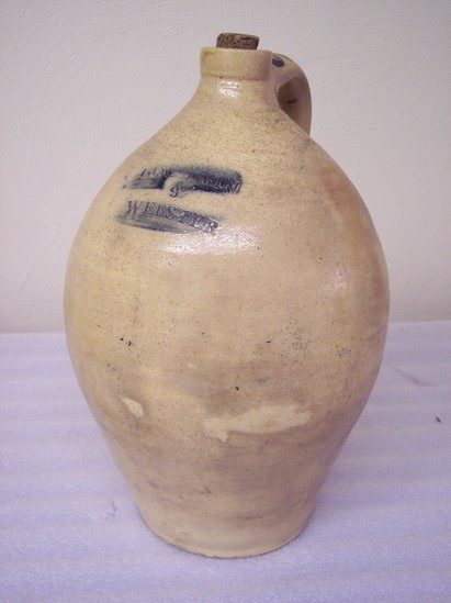 Salt glaze, with blue touches at base of handle and over mark. Bulbous with plain rim. Handle attached at rim and shoulder. Cork in jug.