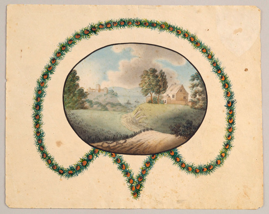Uncut, watercolor on paper design for a hand-screen. Depicts landscape scene--seashore, houses, harbor, boats--within oval outlined in black. Garland of peacock feathers in black, orange, and green surround the oval.