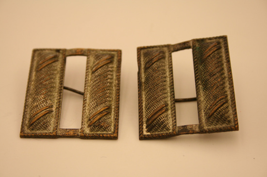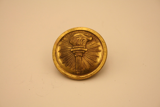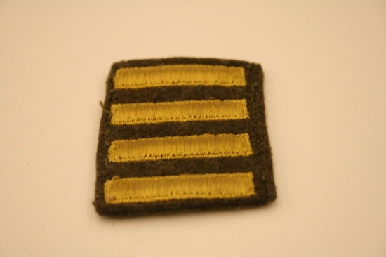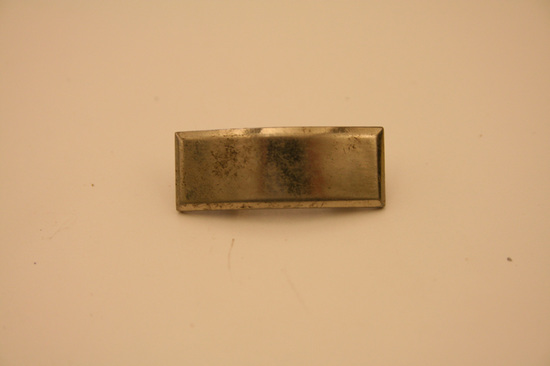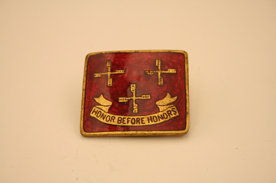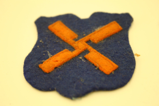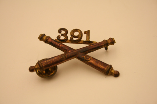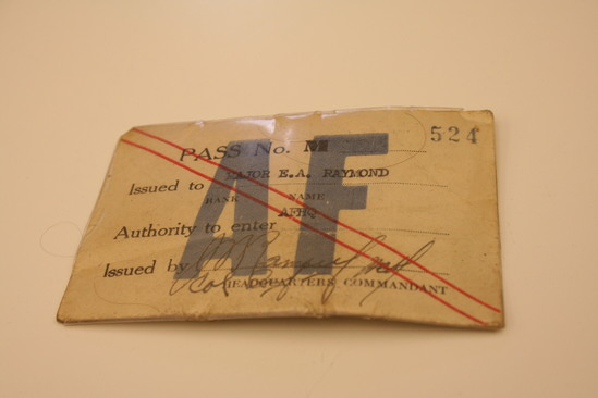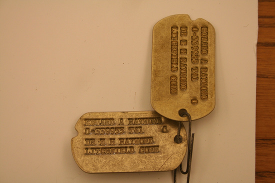 Collection of World War II era ephemera, associated with Edward A. Raymond of Litchfield, Connecticut. A: 1st Lieutenant's Bar - silver, curved, rectangular shape B: Pair of Captain's bars - silver, square, rectangular shape with hole in center C: Medal bar ribbon issued with European-African-Middle Eastern Campaign Medal. D: Round gold colored pin with torch insignia stamped at center. This is the Torch of Knowledge insignia worn by ROTC cadets. E: Pin of crossed cannons with the number "391." F: Shield-shaped pin with dark blue enameled background with opened book of white with gold trim, with Hebrew lettering across the pages. Written in gold, "LUX ET/VERITAS." This is the coat of arms of Yale University. G: Square pin with red, enameled background. Three windmill arms in gold above gold banner, with text "HONOR BEFORE HONORS." H: Two blue, cloth patches with gold windmill arms. These are shoulder sleeve insignia for the XII (12th) Army Corps, United States Army. I: Patch of olive green with four horizontal, gold stripes. These are Overseas Service Bars meant to be worn on a uniform sleeve. Each bar denoted six months of overseas war service. J: Dog tags of Edward A. Raymond. Two total. Stamped on tags "Edward A. Raymond/0-339955 T41/Dr E H Raymond/Litchfield Conn." K: Military pass issued to Major E. A. Raymond. White with two thin, red stripes diagonally across front, from top left to bottom right. Large blue text, "AF" in center. Pass inserted into plastic sleeve. Pass granted access to Allied Force Headquarters (AFHQ).