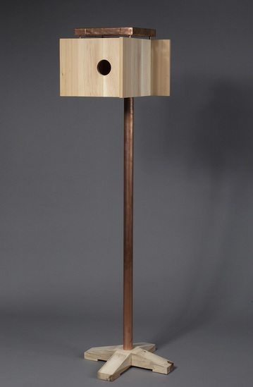 Tall stand alone bird house. Base of two pieces of wood crossed over each other. Cylindrical copper pipe elevates house. Bird house made of wooden box with each side extending 4" past square frame. Hole cut into one side. Door underneath box with brass hinges and clasp. Square copper roofs slightly elevated on copper piping above top of box.