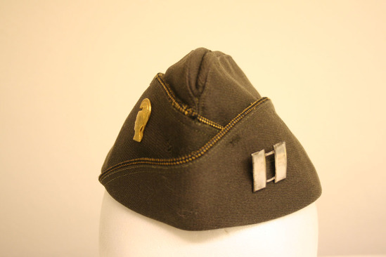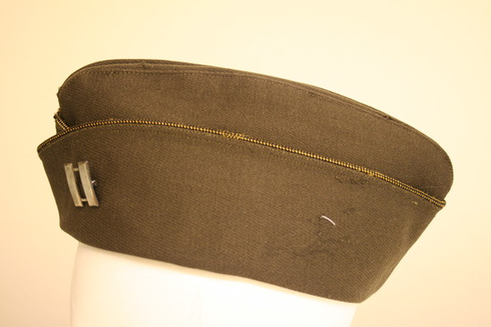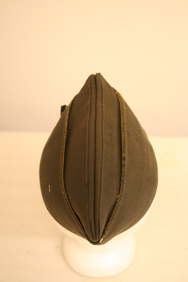Olive green cap with cuff edged with black and gold cord; 2 pins on left - 2 vertical silver bars joined with narrow horizontal pieces and Roman Soldier's head in profile, looking towards back; leather sweatband on interior; handwritten on sweatband "Eric Hatch"
