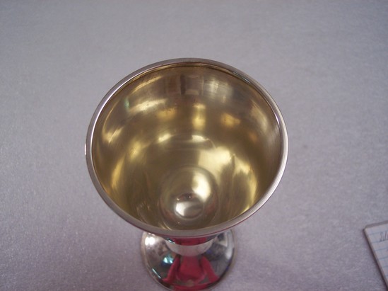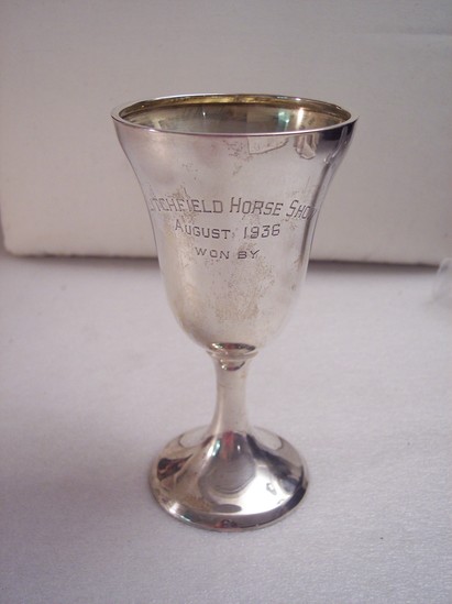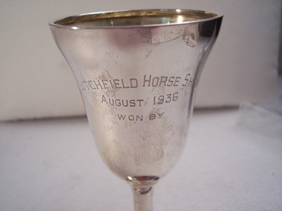 Trophy shaped like a chalice. Inside has gold tinge. Engraved on one side "Litchfield Horse Shoe/August 1936/Won by"