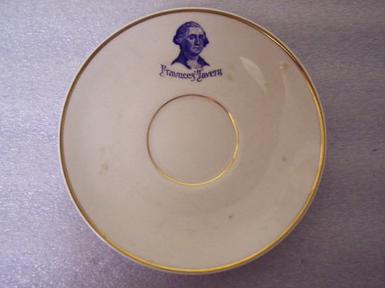Souvenir set. White saucer (B) with gold accents and blue transfer of George Washington with the words "Fraunces' Tavern" centered on top edge. Bottom of plate reads: "L. Barth & Son. New York." Small, white teacup (A) has gold highlighting its rim, the base and the handle. Blue transfer of George Washington and the words "Fraunces' Tavern" on one side. Bottom of cup reads: "L. Barth & Son. New York."