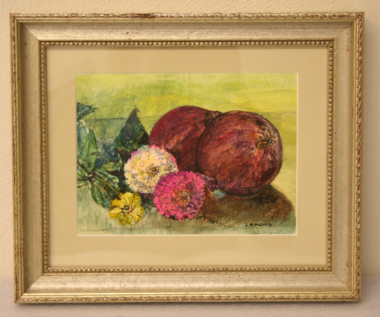 Still life of fruit and flowers in purples and burgundy. Flowers yellow, white, and pick. Signed "Lamond" in lower right hand corner. Framed in wooden frame.