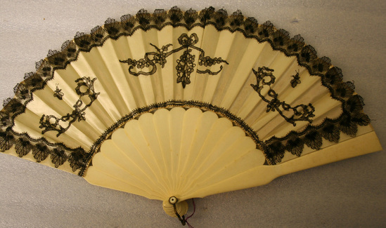 Ivory silk taffeta fan with black lace applique. Border of lace with scalloped edge around top and sides. Three cartouches and two insetcts applied to silk. Ivory sticks. Shaped metal ring at bottom of sticks.