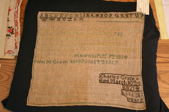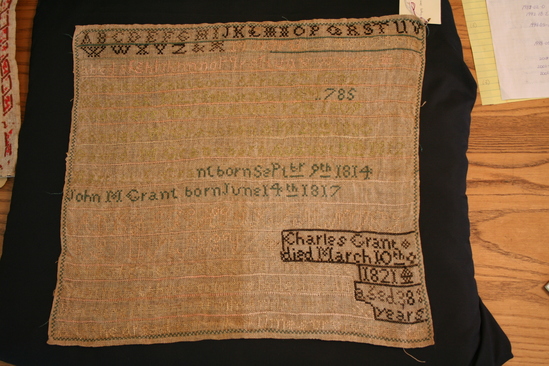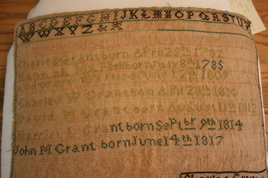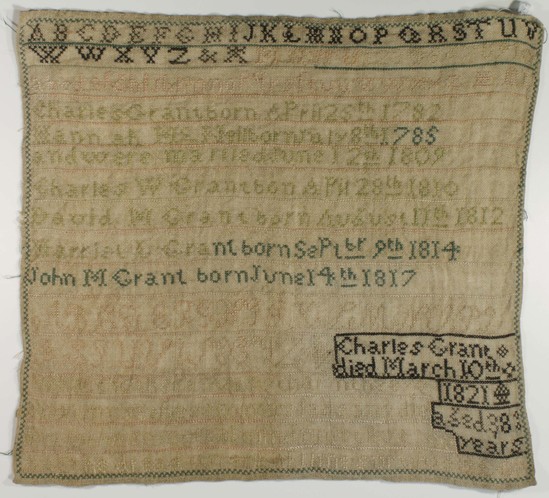 Coarse brown linen ground with green, black, turquoise, and brown thread. Two series of alphabets. Stitched underneath " Charles Grant born April 25th 1782 Hannah McNeil born July 8th 1785 and were married June 12th 1809 Charles W. Grant bon April 28th 1810 David M. Grant born August 11th 1812 Harriet L. Grant born Septbr 9th 1814 John M Grant bron June 14th 1817 Another alphabet stitched underneath this above family registry. Under this alphabet is stitched: What that charm the eye Soon must these colours fade and die But lo the immortal mind must live And the dread wreck of time survive Followed by the initials "HLG" Added to the right side of the poem in black thread "Charles Grant/died March 10th 1821/aged 38/years"