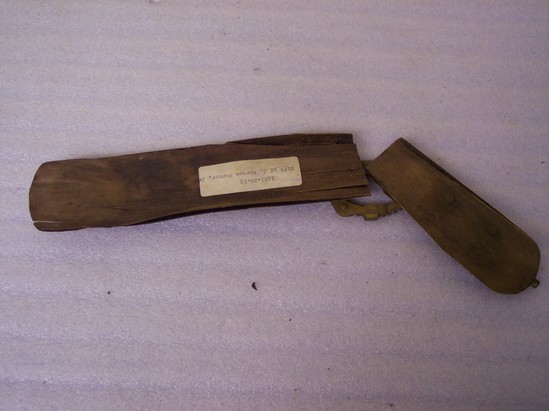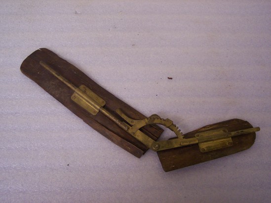 Leg or arm splint - wood. Two pieces of wood connected by brass bar. At joint of bar is a mechanism which allows wood pieces to be adjusted to 90 degree angle or other angle. Mechanism semi-circular, projects up from brass bar. Notches along semi-circle where clasp rests and can be adjusted.