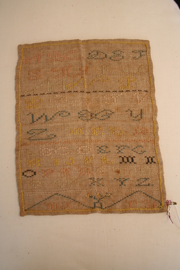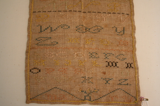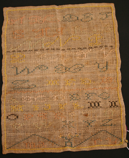 Coarse linen ground, shades of pink, green, yellow and black threads. Colored faded on front. Alphabet stitched in wide script "MFD 18" after; alphabet restitched in more block lettering, "MARY" stitched at bottom, design lines divide sampler into 4 sections