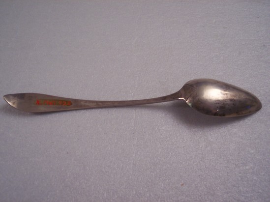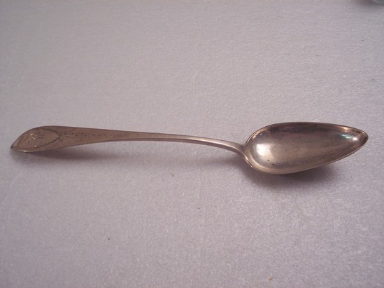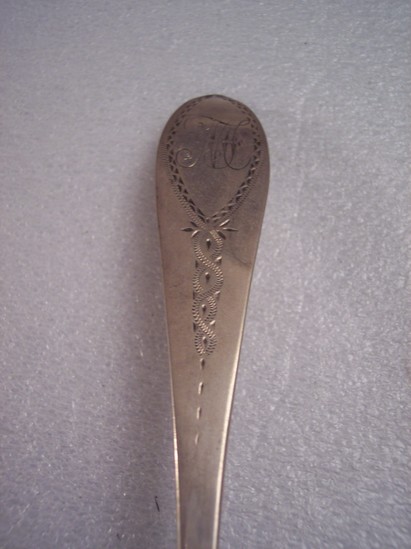 Identical spoon 1907-02-12 Large silver tablespoon with "MF" engraved at end of handle, etched design around engraving and running down sides of handle