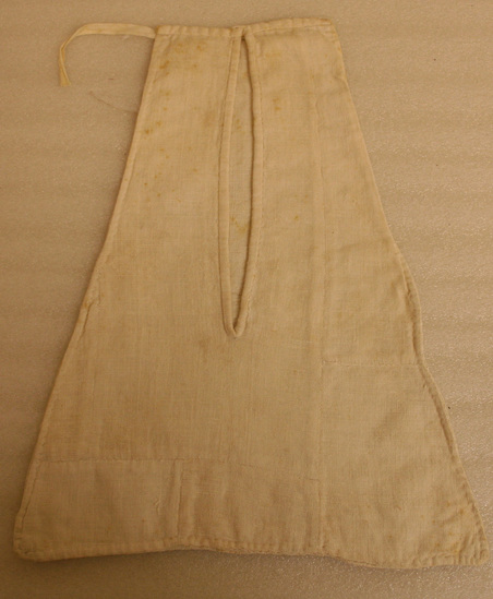 White linen pocket. No design or ornamentation. Slit or opening started at top center and extending 8 1/2" down length of pocket. One piece of cotton tape still attached to top side of pocket. Pieces of linen patched together along bottom to form body.