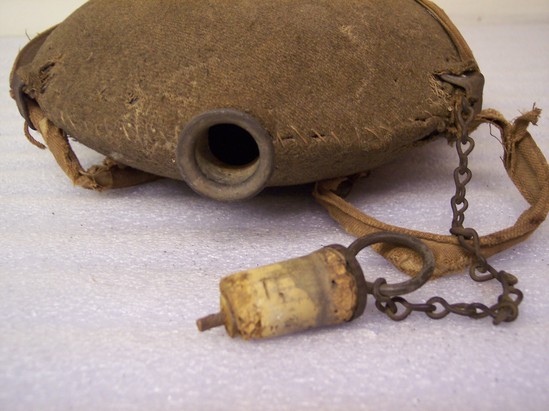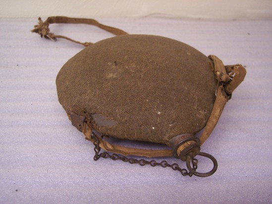 Round metal canteen with olive colored wool cover. Chain attached to neck of canteen with cork stopper at end