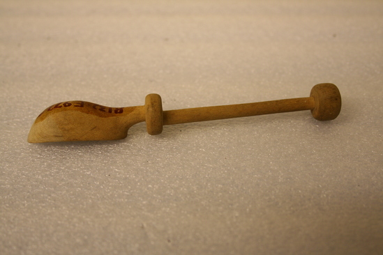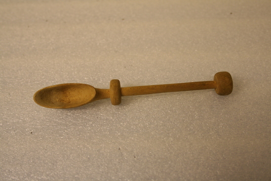 Carved wooden mustard spoon with oval deep bowl, ring near bowl, round handle with ring end. Each whittled from a single pieces of wood by Mr. Warner