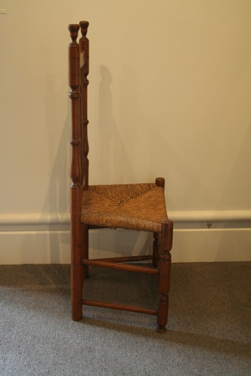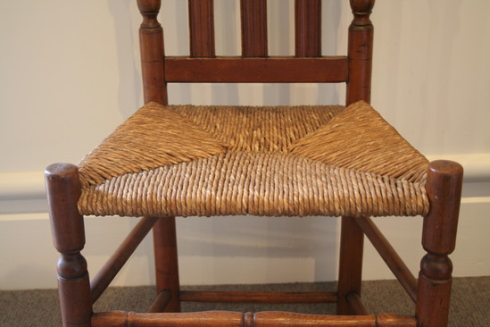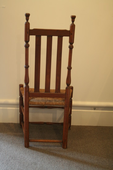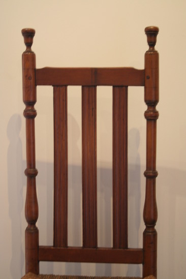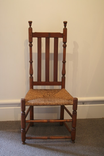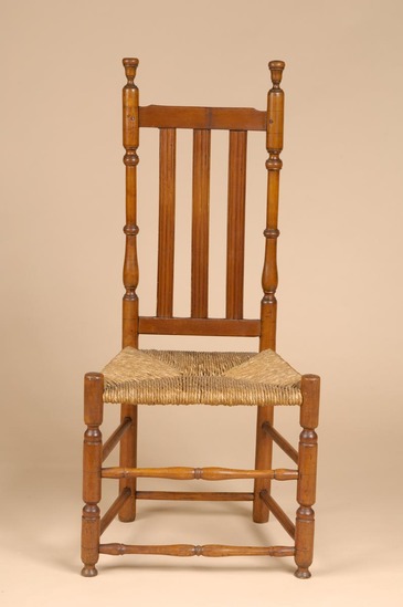 Turned maple side chair, back posts have ring and vase turning wit vase finial; straight top rail slightly cut down at each end; three flat reeded banisters; front posts have ring turnings ending with button feet and tops extend above seat; two slim turned front stretchers; two rungs on each side and one in rear