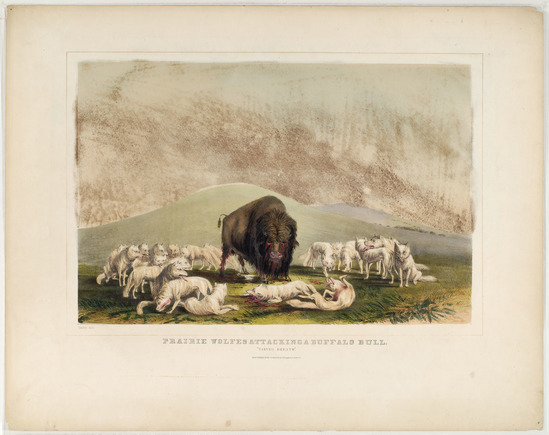 Lithograph printed by Currier & Ives, 152 Nassau St., New York City, NY after the original painting by George Catlin. Picture of buffalo encircled by pack of wolves in front of a hill on which the rest of the buffalo herd grazes. Two wolves have been wounded and are laying on the ground bleeding.