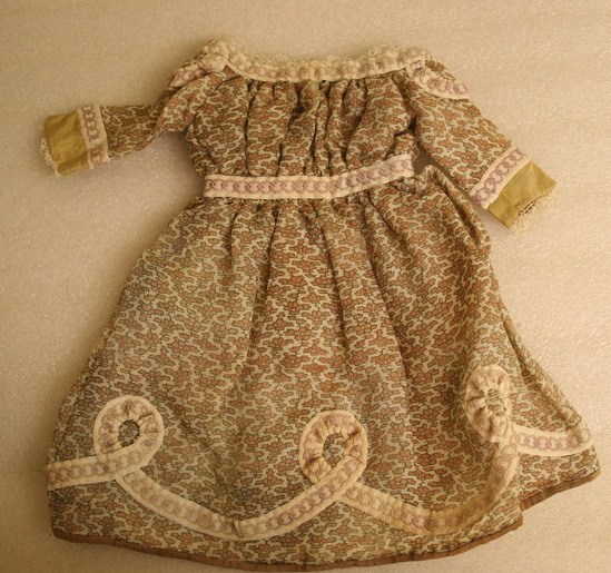 Doll's dress of brown floral printed design on white cotton. Neck and cuffs trimmed with lace. A white woven silk braid with purple chain pattern is sewn on edge of collar, sleeves, around waist and decorates the hem in loops. Boat shaped neckline. Bodice pleated in front and back. Long sleeves. Dress lined.