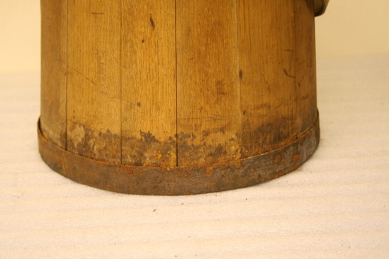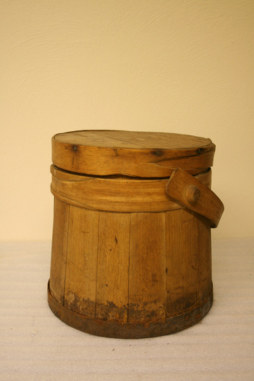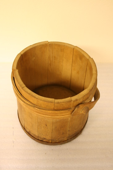 Wooden bucket with lid. Semi-circular handle bent over top of bucket. Base of bucket wider then opening - bucket narrows slightly from bottom to top. Bucket constructed out of vertical slats of wood that are held together with an iron band at the bottom and a wooden band at the top.