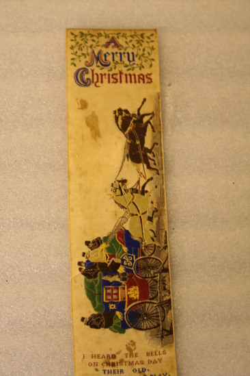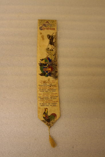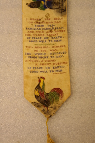 Cream silk ribbon. Bottom of ribbon, corners turned in to create a point and there is a tassel hanging from the bottom. "A Merry Christmas" embroidered at top of ribbon. Set horizontally on ribbon is a scene of a stage coach drawn by horses. Underneath is a poem by H.W. Longfellow. A crowing cock is at the bottom of the ribbon under the poem