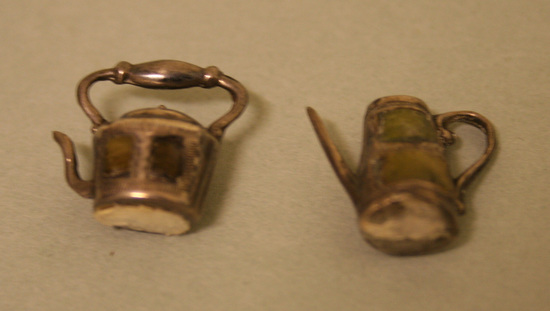 Coffee pot and tea kettle - both made of silver and inlaid with two rectangular pieces of Konncemora marble (green). Tea Kettle oval shaped with S shaped spout. Handle at top of kettle with pronounced hand hold section in center- thicker and demarkated by two round balls. Coffee Pot - taller than kettle, cylindrical shape with handle on one side and straight spot on opposite side.