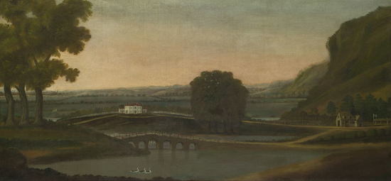 Oil on canvas painting of a landscape, horizontal plane, high cliffs on the right, a group of three maples on the left, between is a meandering stream. Rolling hills in the background, in the center on a small hill is a white federal style mansion with red roof, white picket fence, a road from the right leads to the house over a small bridge where there is a gate house, sign and horse sheds. There are three swans in the stream.
