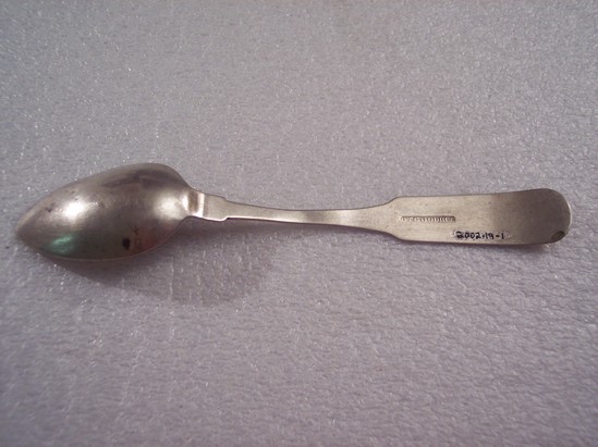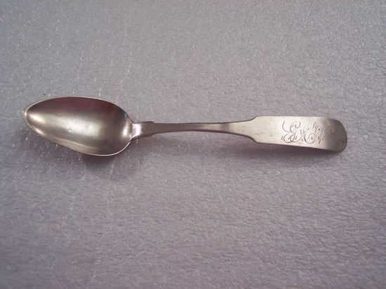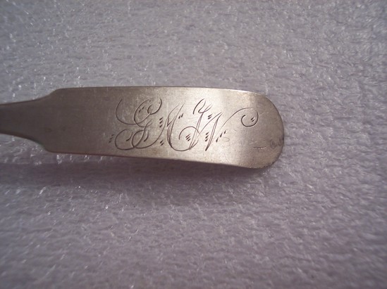 Silver teaspoon engraved with the initials "GMW" in florid calligraphy on the handle. The reservse side contains the makers name stamped on the handle "DTGOODHUE"