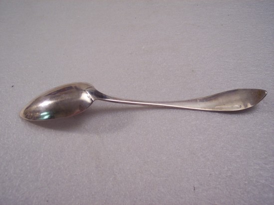 Large silver table spoon made for Judge Tapping Reeve by Isaac Thompson. Spoon engraved on handle in block lettering "Reeve" which is encircled by a wreath etched into handle.