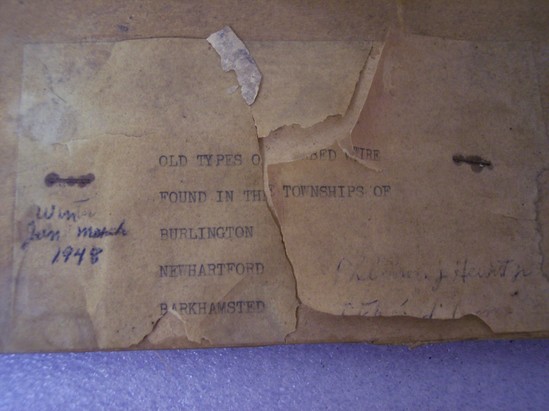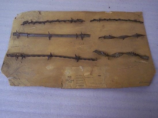 Rectangular piece of cardboard with six different types of barb wire mounted on piece. Wire was taken from towns of Barkhamsted, Burlington and New Hartford