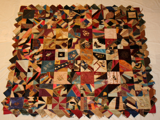 Silk and velvet patchwork crazy quilt. Made in the friendship manner, comprised of random pattern individually made patches, some with embroidery, sewn together using various stitch patterns in various color threads. Saw tooth edges. Backed in brown silk.