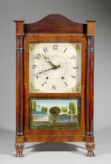 Pillar and scroll shelf clock, mahogany , animal paw and leaf feet, turned back feet, plinth base with plain half pillars on sides, large door lower half and eglomise panel with image of Mount Vernon open oval to view pendulum, painted face corners with gilt work and red and green floral sprays, Arabic numbers, top of clock has oblong side blocks with plain arched center panel, flared caps on side blocks.