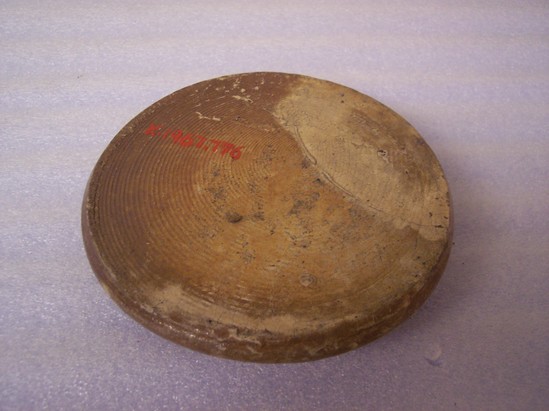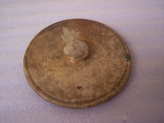 Poorly glazed, chipping. Potter's wheel marks on bottom. Knob-like handle.