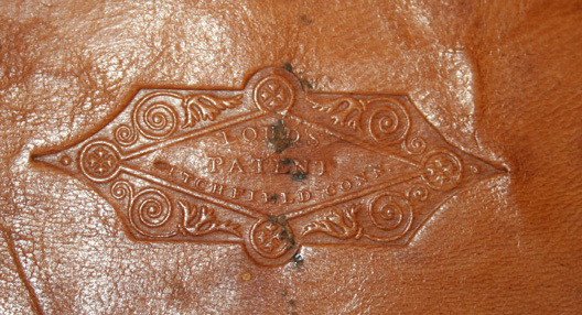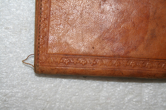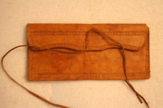 Brown leather tri-fold wallet. Two pockets on interior. Pair of leather flaps over top pocket. Wallet decorated with tooled leather design. Maker's stamp on outside of bottom pocket with tooled design around stamp "Lord's/Patent/Litchfield, Conn." Leather strap to closet wallet