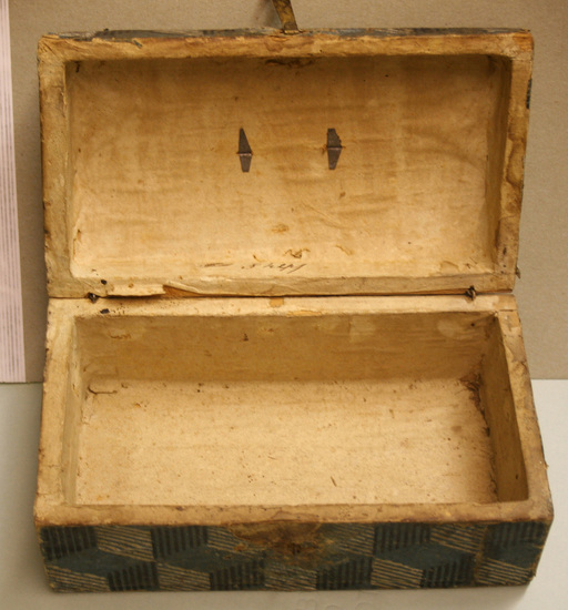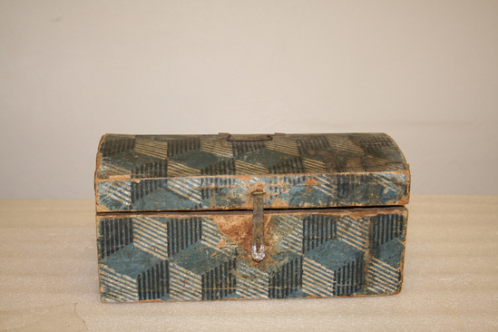 Trunk like box, wood covered with paper. Paper is design of silver and two shades of blue - diamond shapes of repeating line, diamonds placed in different directions to have paper texture. Rounded top. Delicate metal handle on cover