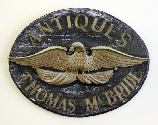 Wooden oval sign. Painted black but white primer layer visible underneath flaking paint. In gold lettering "ANTIQUES/THOMAS McBRIDE" In center 3 dimensional eagle - protrudes from body of sign - painted gold, wings spread, head turned to the left, swag of bunting underneath. Two round iron hooks on back of sign.