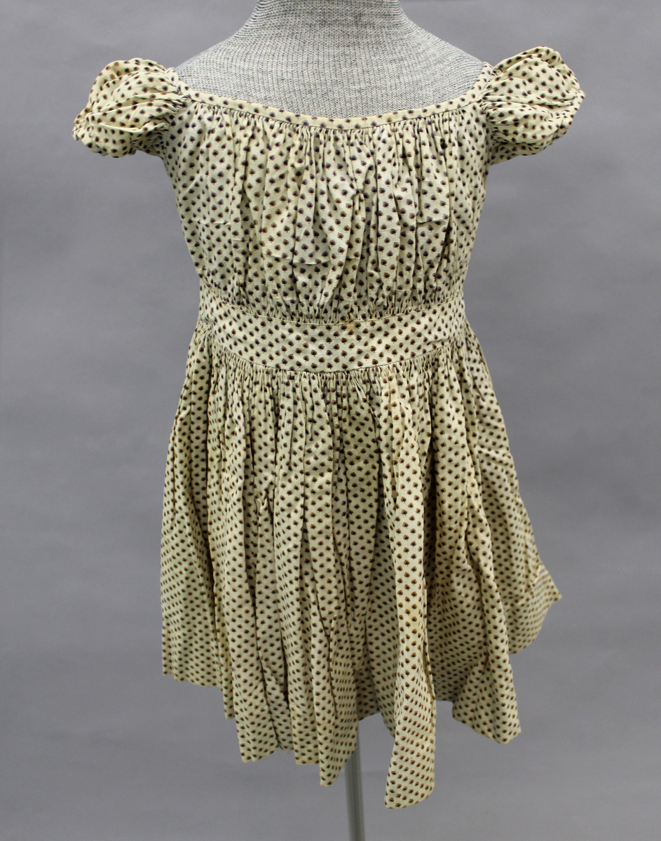 White and brown cotton calico child's dress; gathered front and back bodice; short puff sleeves; waistband; drawstring closures at neck; two hooks and eyes at waistband