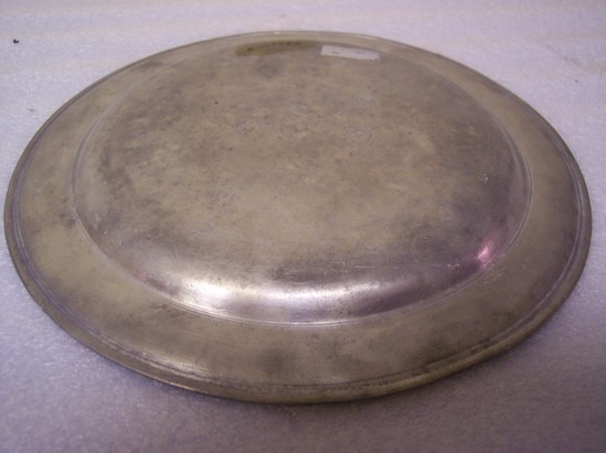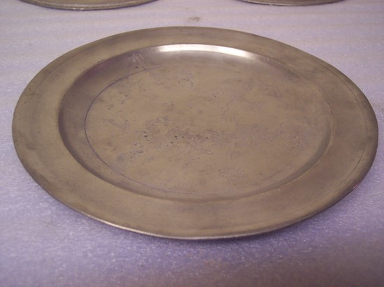 Pewter plate, pitted, single reed rim, reed in dish; two marks on back - "THOMAS D." over eagle touch, "BOARDMAN" underneath