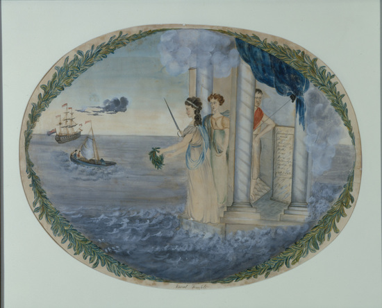 Classical temple at right; two women in classical Greek garb, one on left with sword and wreath gesturing to an American 3-masted ship and an L-masted boat with three men in it. Man in temple with sword; faces right to pedestal that contains the inscription, "Truxton/Bainbridge/Decatur/Hull/Jones/Perry/McDonough/Lawrence/Porter/1812 & 1813." Entire scene is within an oval which is framed with green leaves.