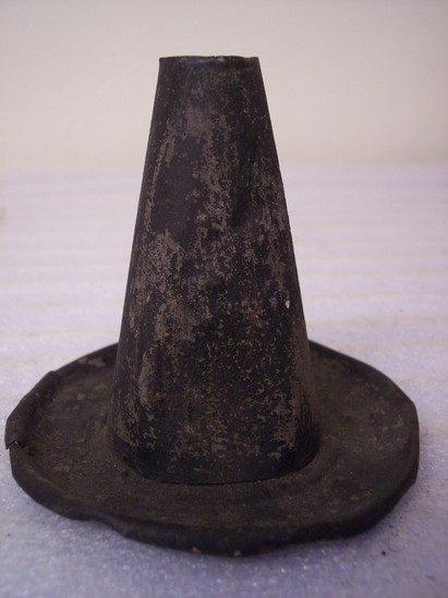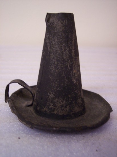 Round saucer like base with cone shaped stem. Hole in top to insert candle. Small curved piece of tin at base of cone to act as a handle.